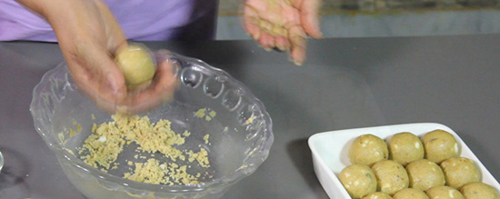 मिश्रण को थोड़ा-थोड़ा हाथ में लीजिये और दबा दबा कर अपने मन पसन्द आकार के लड्डू बना कर थाली में रखिये. सारे मिश्रण से लड्डू बना कर थाली में रख लीजिये. सभी लड्डूओं पर पिस्ते के टुकडे़ सजाएं. बहुत ही अच्छे और स्वादिष्ट सत्तू के लड्डू बनकर तैयार, परोसिये और खाइये. बचे हुये लड्डू कन्टेनर में भर कर रख लीजिये और 2 महिने तक खाते रहिये.